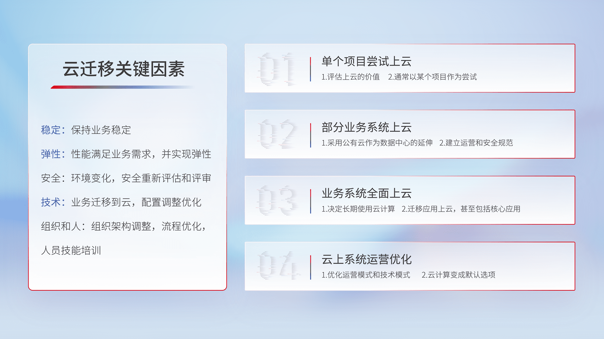 结合实际业务,,从规划设计、、、云平台选型、、云原生改造、、、、数据迁移、、、集成交付,,迁移全过程为客户识别最佳上云路径,,,,做好风险识别管理,,,,设计网络架构、、、、身份权限、、安全审计合规、、、操作审计、、日志审计、、监控告警策略、、、多站点容灾设计等,,,,对云上基础设施进行整体规划,,提升IT治理水平,,,以满足弹性、、、、高可用、、高性能的需求。。。。