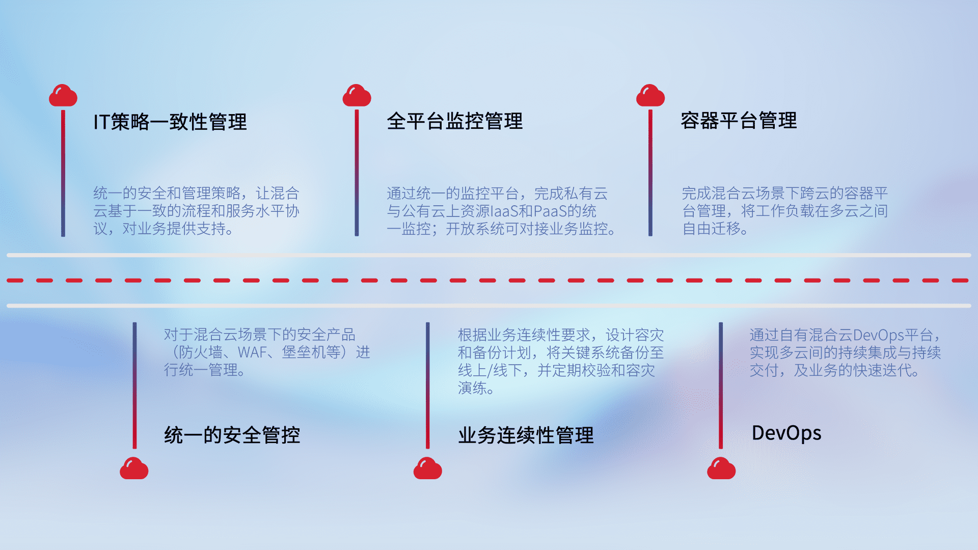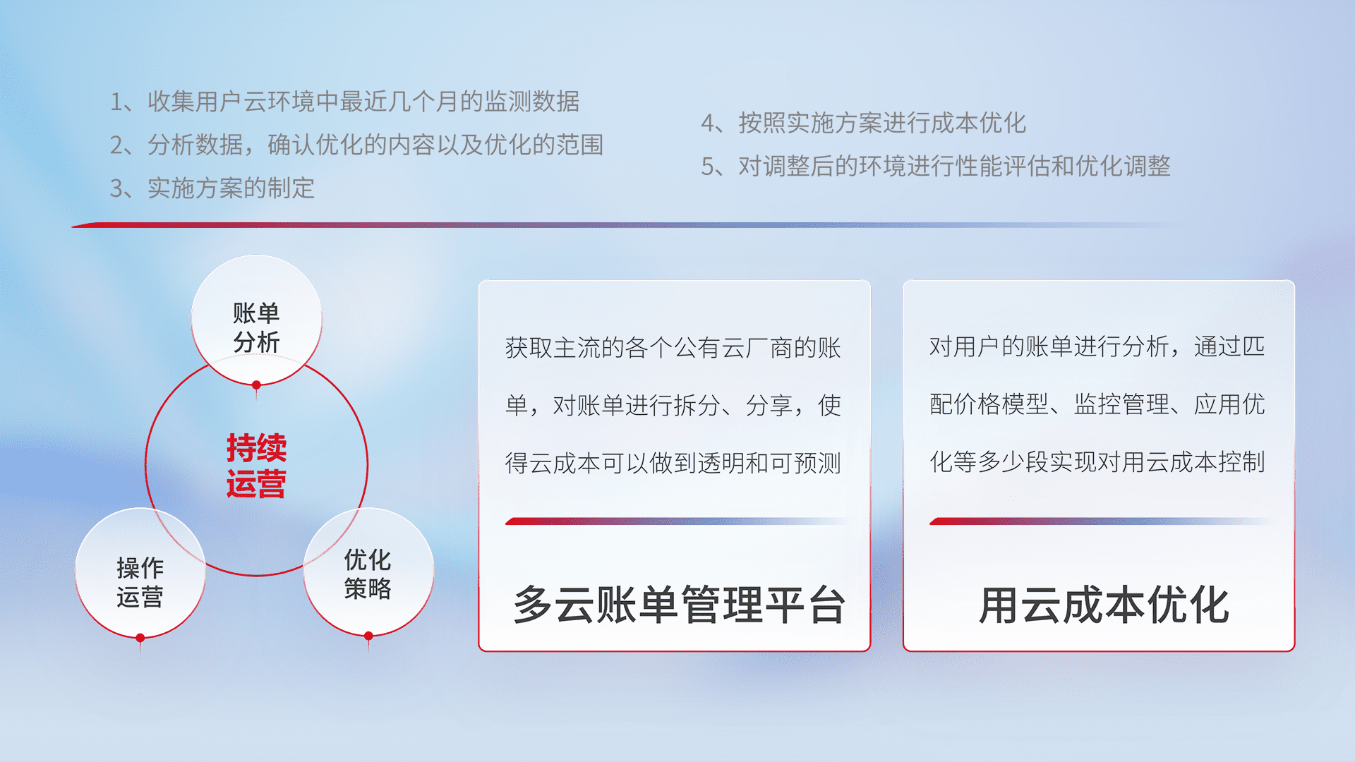 通过多云纳管,,以统一的资源数据模型把客户的云资源进行抽象和封装,,,进而实现对多云资源的统一操作,,保障云资源管理的可靠性、、稳定性与可用性。。量身定制化运维内容,,配置、、、开发运维、、补丁管理、、、、备份、、、、监控、、认证和访问管理、、、、审计和日常巡检等,,,保障在用云过程中的可靠度,,,,稳定度以及高可用率。。